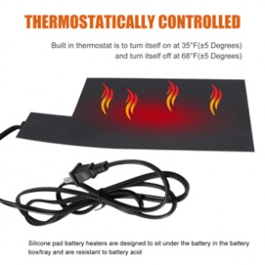 Battery Heat Pad Size: 8-1/2" X 5-1/2" Foam Pad thickness:1.5 mm Voltage: 120 V Power: 60 W Lead Wire Length: 70" |